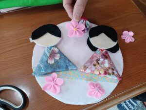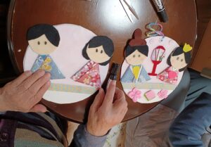 職員が準備したパーツを、皆さんに組み合わせ表情を付けてもらう事で、一人一人違ったお雛様が出来て行きます。